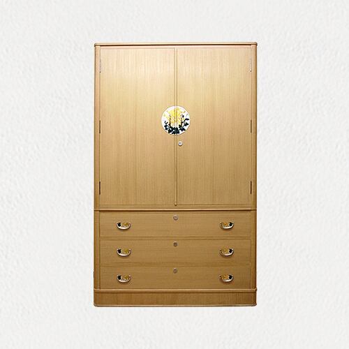 扉の内側はお盆が6枚、板盆が2枚、小引が2段。 金具は手彫りの菊の模様で、見栄えの良さが魅力。 今回BASEデビューで、お値段据え置きで出品です。 次回から15万円ほどアップします。ぜひこの機会にご購入 お願いいたします。 ■色:トノコ仕上 ■サイズ:W1090 × D455 × H1720 ■備考:胴厚46mm、盆6枚、帯入2、小抽出2